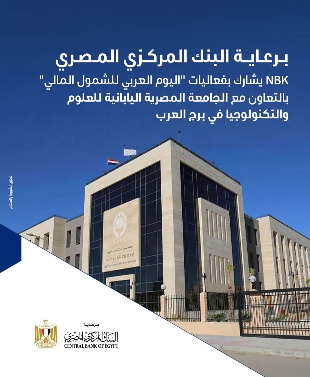 يتيح بنك الكويت الوطني-NBK لعملائه احتفالا باليوم العربى للشمول المالى بالجامعة المصرية اليابانية للعلوم والتكنولوجيا ببرج العرب، فرصة فتح مجموعة من الحسابات المصرفية، بما في ذلك حساب توفير الشباب، وحساب الشمول المالي للأفراد، وحساب توفير للمرأة "لكِ"، بالإضافة إلى حسابات المنشآت المتناهية الصغر، بدون أي مصاريف لفتح الحساب وبدون حد أدنى، باستخدام بطاقة الرقم القومي فقط.