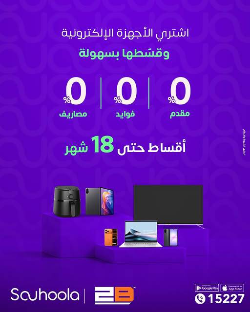 يتيح تطبيق Souhoola فرصة مميزة لشراء مختلف الأجهزة الإلكترونية من 2B بنظام تقسيط ميسر، بدون مقدم أو فوائد أو مصاريف إدارية، بما يسهم في تسهيل تجربة الشراء وتقليل الأعباء المالية.