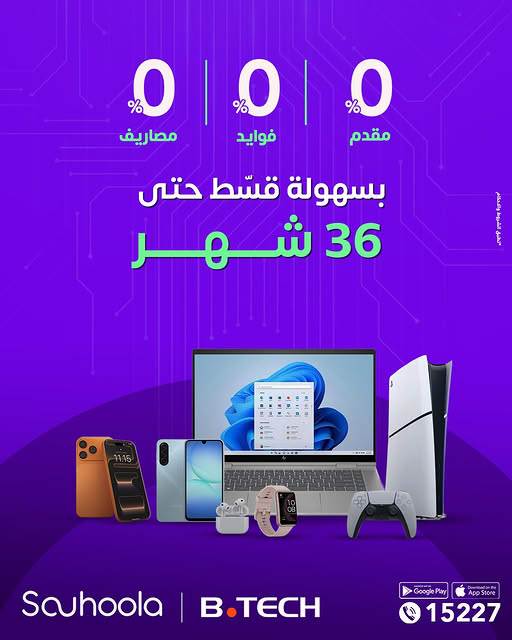 أعلنت شركة B.TECH بالتعاون مع تطبيق Souhoola عن إطلاق عرض تقسيط مميز يتيح شراء الأجهزة الإلكترونية بدون مقدم أو فوائد أو مصاريف إدارية، وذلك لفترة محدود.