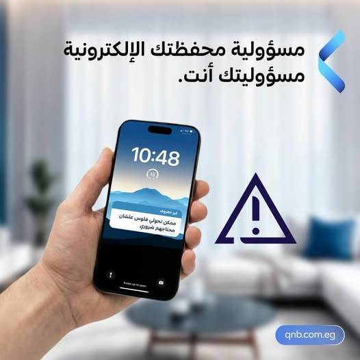 نوه بنكQNB  مصر عملائه بأن جميع عمليات الشراء أو التحويل أو السحب التي تتم عبر المحفظة الإلكترونية تُعد من مسؤوليتهم الشخصية الكاملة، حيث يتم تنفيذ هذه العمليات بناءً على البيانات الخاصة بهم، لذا يُرجى التأكد من مراجعة العمليات بدقة.