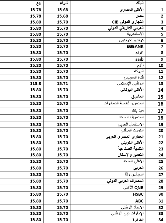 للشراء، 15.81 جنيه للبيع، يليه بنوك: (CIB – الإسكندرية - العربي الإفريقي – كريدي أجريكول – EGBANK – عوده – بلوم – الأهلي الكويتي