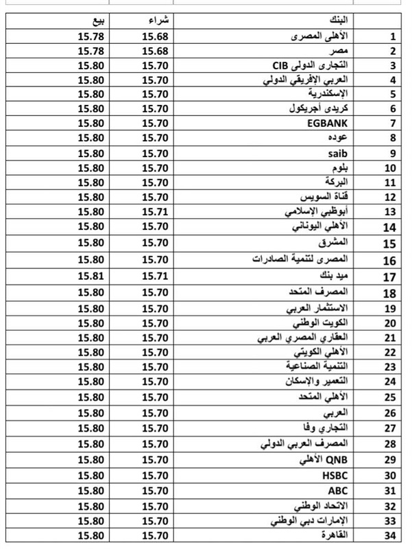 عند مستوى سعر 15.68 جنيه للشراء، 15.68 جنيه للبيع، يليهم بنوك: (CIB – الإسكندرية - العربي